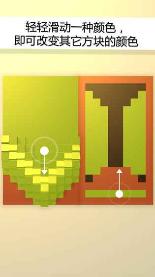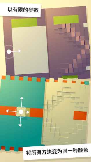 在《COBE画廊》主界面,向左滑动屏幕能看到系统提供的九个以壁画形式呈现的关卡。随意点击一幅壁画便可进入游戏,壁画由两至三种颜色拼接,玩家要将颜色统一成一种才能过关。但通关后仅有简单动画,无提示和结算,已通关关卡仍可重复玩,让人费解。