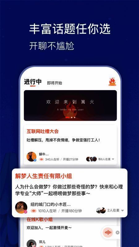 篝火app是一款具备丰富话题讨论内容的聊天软件,聊天环境安全可靠。你能参与各类社交活动进行互动交流,结识的人会越来越多。无论你是倾听者还是讲述者,都能为自己创造更多良好机遇。快来下载体验吧!