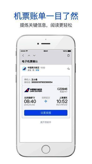 6. 服务信息卡片:机票、快递等邮件卡片展示,信息清晰。