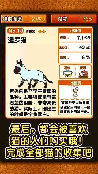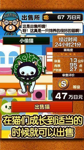 1、猫咪成长:在猫咖啡店里,小猫仔会成长为各式各样的猫咪。而且越稀有的猫,收购价格越高哦!