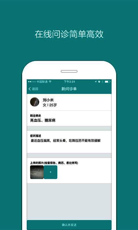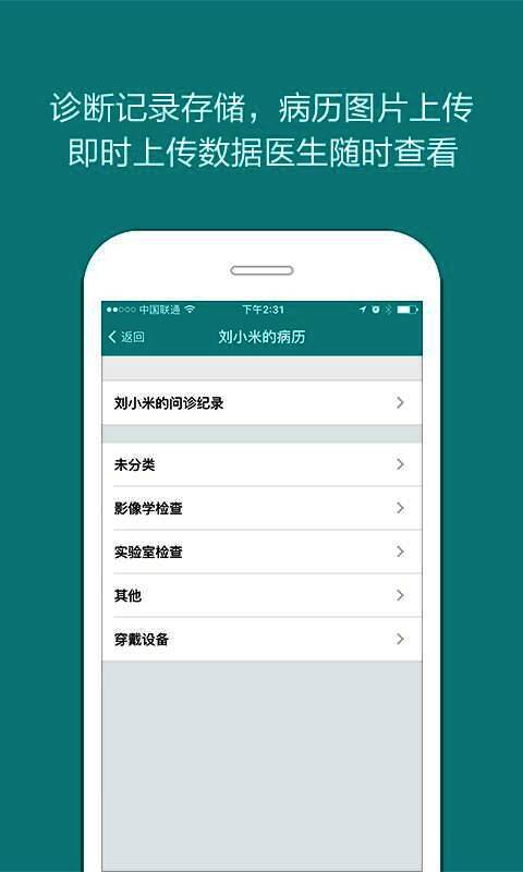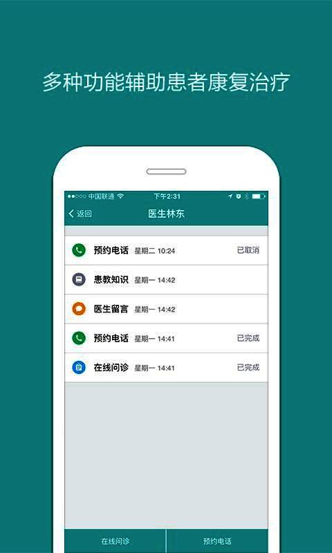 1. 界面简约,操作便捷。2. 多种功能助力患者康复治疗。3. 在线问诊高效简便。4. 可存储诊断记录,上传病例图片。5. 能即时上传数据,方便医生随时查看。