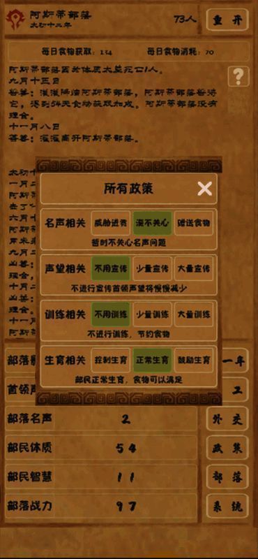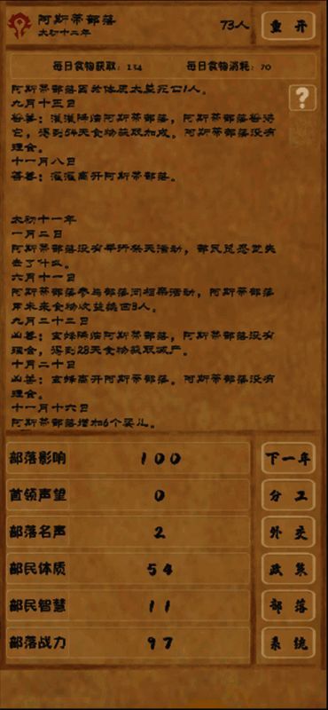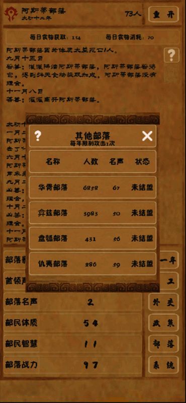 游戏采用开放式设计,玩家可按喜好策略选发展道路,和平扩张皆有舞台。过程中会遇自然灾害、外敌入侵、内部矛盾等,触发剧情任务,体验部落发展的苦与乐。