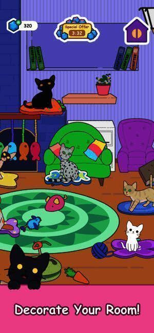 2、用时髦物品装饰房间,购买猫玩具,开启稀有品种,陪猫咪玩耍。