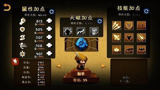 5、通过英雄属性养成,包括攻击、体力、攻速、闪避、暴击,能打造出特点鲜明的独家英雄;