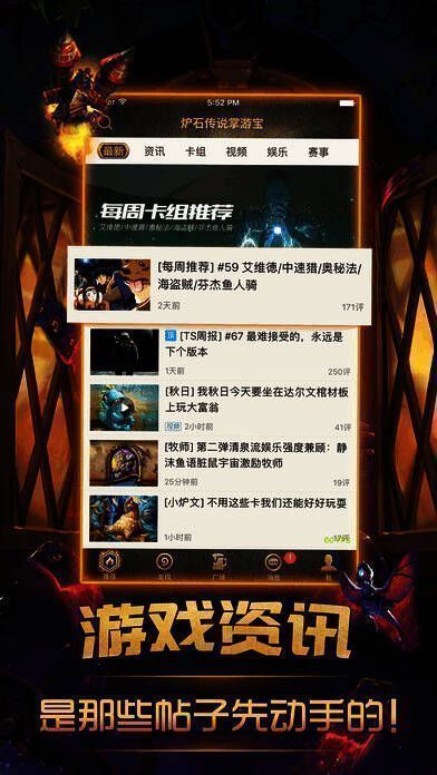 它是游戏宝典,能让玩家实时掌握一手资讯,拥有海量精选视频和主流职业卡牌搭配,带来全新体验,邀玩家横扫《炉石传说》。