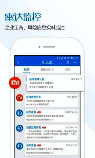 4、【侦查级的企业信息监控】:企业雷达监控功能可实时监控目标企业,工商信息变动会通过短信、APP或邮箱及时告知。
