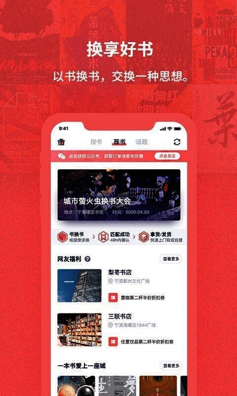 通过不断的书籍交换,实现书尽其用,真正达成换享经济;提供书友圈、近期活动等,带来线上线下相结合的服务;助力商家推广获客,让用户通过交换闲置物品和技能结识新朋友。
