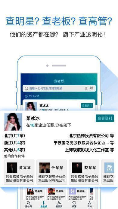 天眼查覆盖超 5000 万明星、老板及企业高管,全国企业覆盖率超 99%。可任意查询目标人物关系网,查看百余种数据维度,信息同步更新,无需登录免费查找,关系梳理透明化,还有专业信用报告等功能,适用于所有人群。