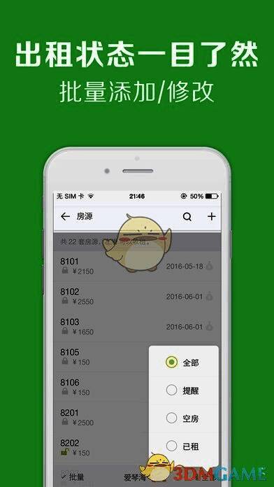 3、房源状态一目了然,设有提醒、空房和已租房间勾选区域,可自由查看不同房源。