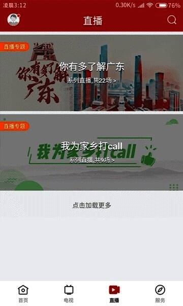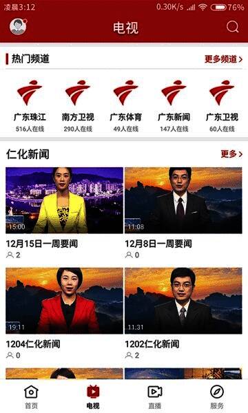 进入首页点击搜索查找想看的新闻;查看推荐的重要新闻资讯;点击电视可找到电视频道和广播频道;点击播放即可在线观看电视节目;进入直播专区看新闻直播可与人交流;选择服务可体验政务和生活服务。