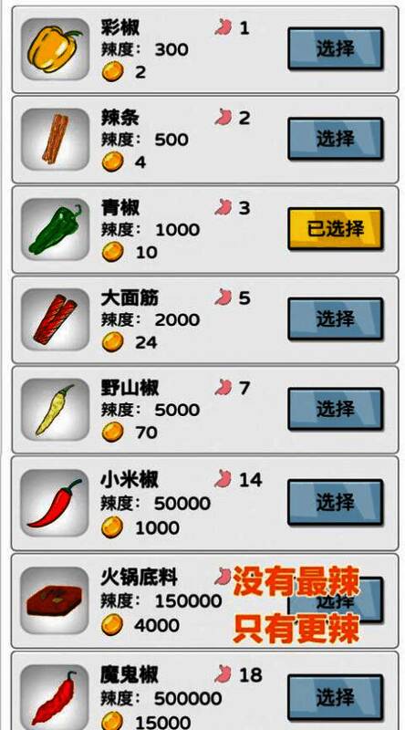 3. 准备了从低辣到超辣不同等级的辣椒,让玩家感受不同辣度和新鲜感。