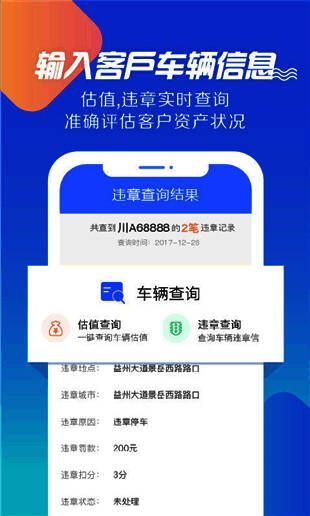 2. 输入客户车辆信息,即可实时查询估值和违章情况,准确评估客户资产。