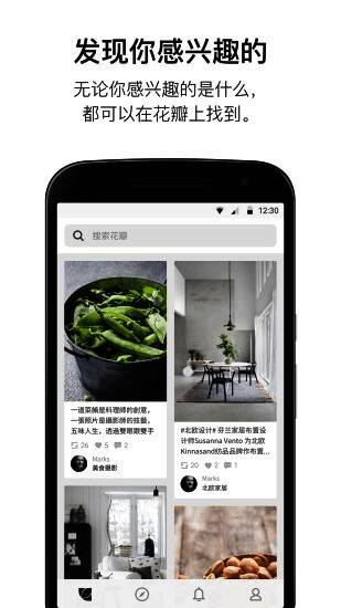 1、探寻你感兴趣的事物,如设计、家居、美食等,花瓣上应有尽有。
