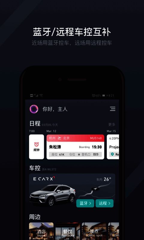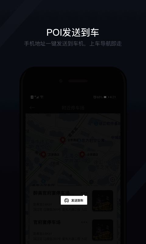 有车载蓝牙遥控系统,近场用蓝牙、远场远程控制汽车;可扫码快捷登录车机;能将POI发送到车辆,一点击手机地址就传至车载机器启动导航。