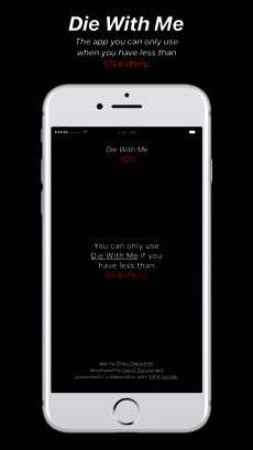 “Die With Me”意即“和我一起死”,此 app 专为手机电量即将耗尽时使用。当电量降至 5%,它会为用户提供一个聊天室。开发者表示,他们想在手机快没电时做点积极的事,看到人们在没电时仍开心聊天,觉得为大家创造了乐趣。