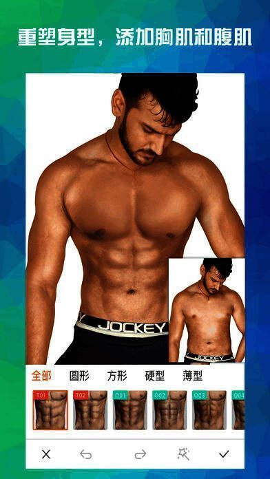 常有男生秀上半身照片显摆身材,现在有了Macho有型app,不用辛苦锻炼,一键就能拥有八块腹肌的有型身材,也能尽情秀。