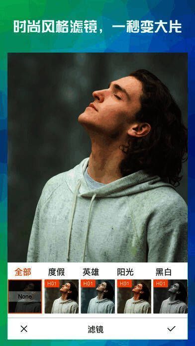 【型男专属滤镜】提供街头潮流、运动阳光、文艺清新、黑白时尚4大男生风格滤镜。