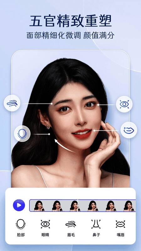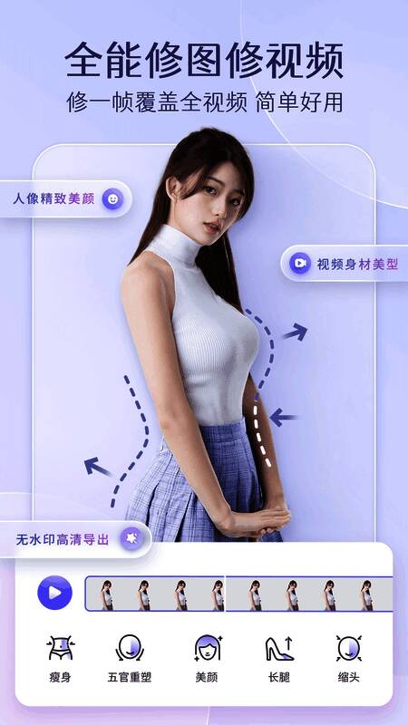 只需短短几步,你就能借助手机实现图片美容。无论是自拍、视频、vlog 旅行视频,还是日常录制的视频,它都能帮你装饰肖像和人物。能恢复面部特征,实现一键小脸、皮肤美容、一键瘦身以及自动腿部拉长。在这里,你不仅能轻松美化视频,还能编辑图片、美化面部,甚至直接美化身体,轻松打造出你想要的面部特征和身体形状效果。