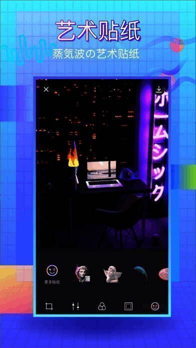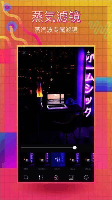 《Vapor Cam》是一款出色的手机端图片编辑器。它为用户提供一系列带有复古、蒸汽元素的滤镜贴纸,营造出浓郁的黑暗潮流氛围,让用户真切感受上世纪蒸汽波的独特魅力,沉浸在意乱情迷之中。