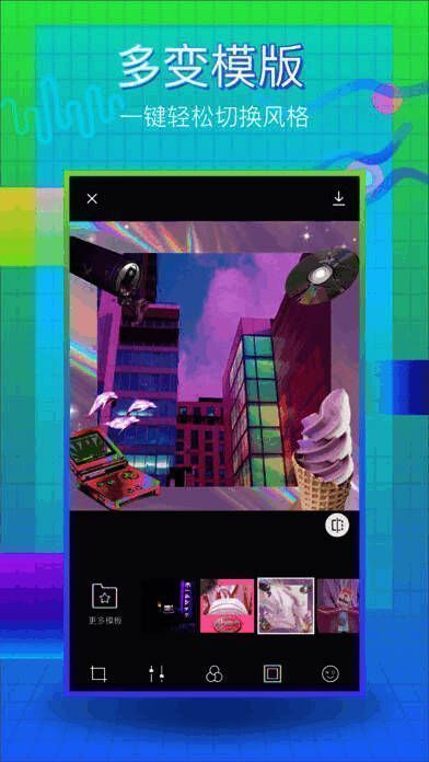 3、模板:VaporCam精心为你搭配模板,把让人眼花缭乱的元素进行拼凑、重整,让你更轻松地融入这个浪漫又迷幻的世界。
