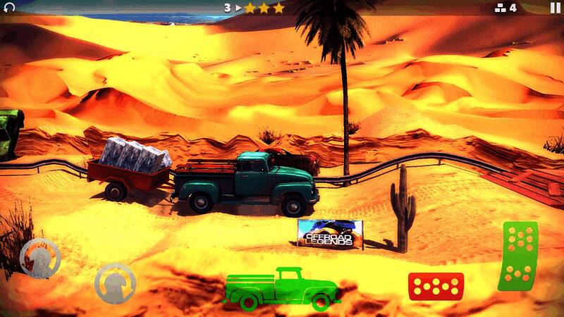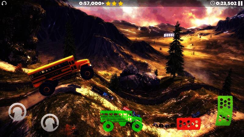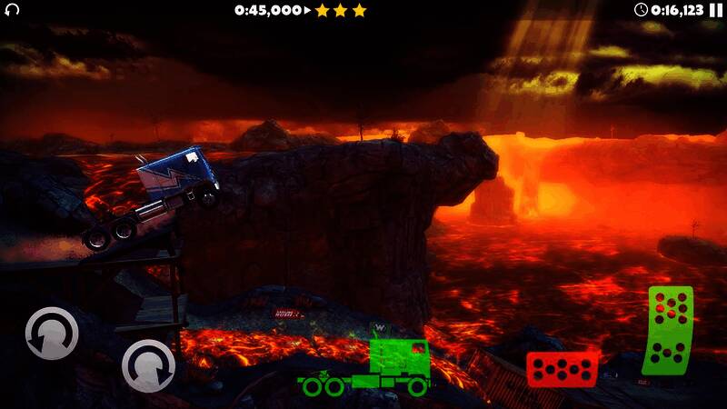 这是一款赛车游戏,玩家将驾驶重型卡车翻山越岭。游戏操作简便,通过画面下方的按钮就能控制车辆前进与后退,还能改变车辆重心,让它完成前滚翻、后滚翻等超高难度动作,同时可操控油门和刹车,避免在路况不佳时撞车。