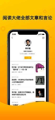 大佬说app是面向广大求知者的阅读平台,可用于文章发布、资讯获取、资料收集、情报获取等。这里入驻了来自投资、金融、创业、媒体、企业、股市等多个领域的专业大佬大咖。通过该app,您能找到属于自己的圈子社区,获取各种最新资讯新闻。app内的文章资讯由大量专业用户提供,您可以享受开放式言论,收集可靠情报。此外,还能关注大佬,第一时间接收和查看其动态文章,参与评论留言提问,与同圈子用户互动,解读更多文章情报。