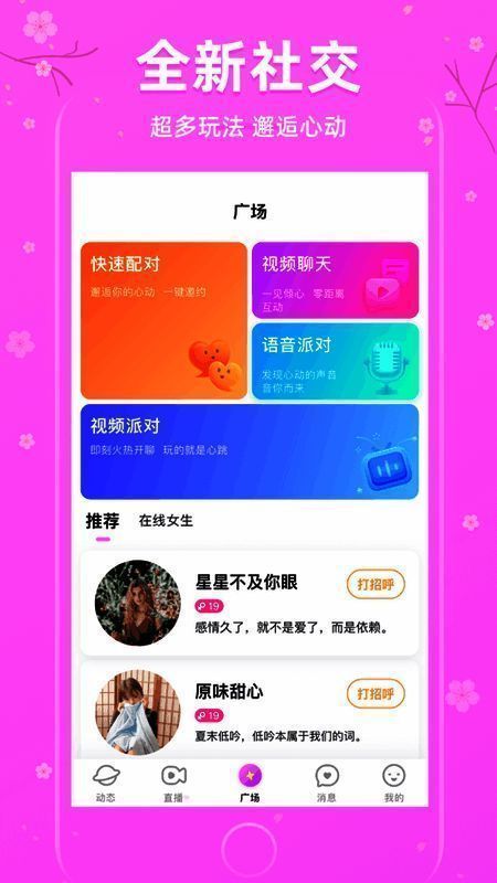 樱花聊天是一款专注陌生人交友互动的脱单神器APP,以真实视频语音交流为主,支持同城见面,开启定位可查看附近想认识的人。个人主页、社区动态、朋友圈等多功能,满足你的多样需求!