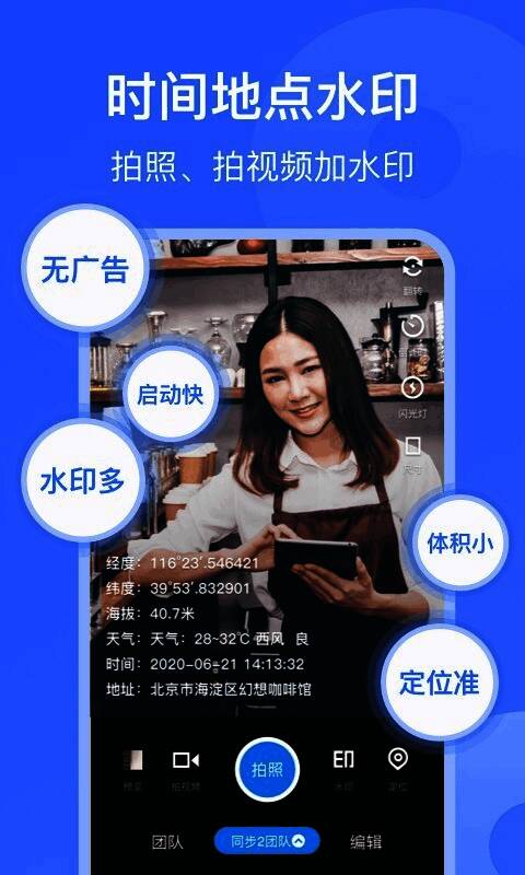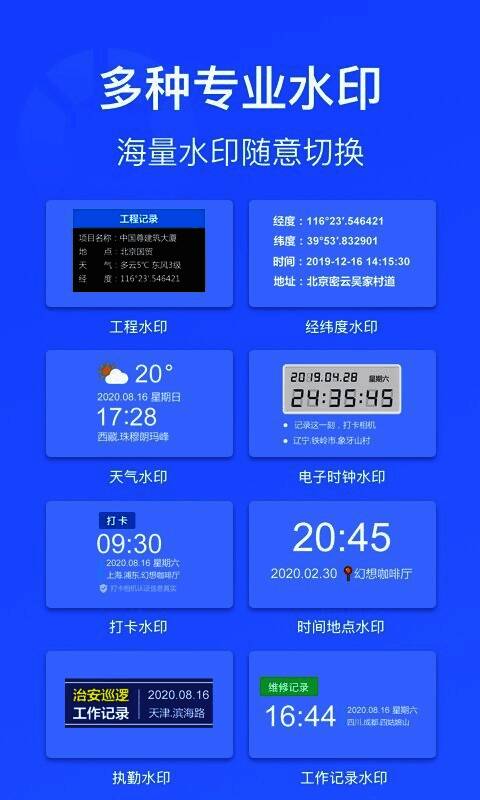 打卡相机是一款为用户提供各类拍照技能的应用软件,属于自定义水印相机。用户能用它拍照、拍视频,可在照片和视频上添加水印,防止图片被盗用,十分便利;还能在拍照时直接设置水印,有时间地点水印、天气水印、经纬度水印、电子时钟水印、工程水印、旅行水印等多种水印模式供用户按需选择;打开软件无广告,能快速进入页面直接使用;可一键将拍摄的视频和照片分享到社交软件,吸引他人关注。