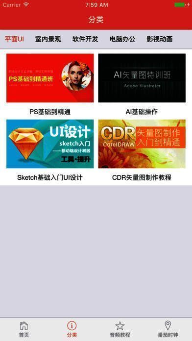 【分类】包含平面UI、室内景观、程序开发、影视动漫、电脑办公等5大精选类别,每个类别下都有相应的视频课程供用户自主选择学习。
