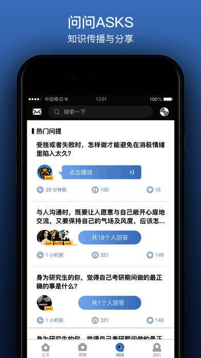 《老子问问》是一款学生语音问答平台,由北京水晶云科技有限公司研发,也是国内首个此类平台。它以智能语音系统为核心,设有“语音问答”“语音直播”“语音私聊”三个功能模块,致力于解决学生信息不畅问题,搭建高中生、家长与大学生、大学老师的沟通桥梁。
