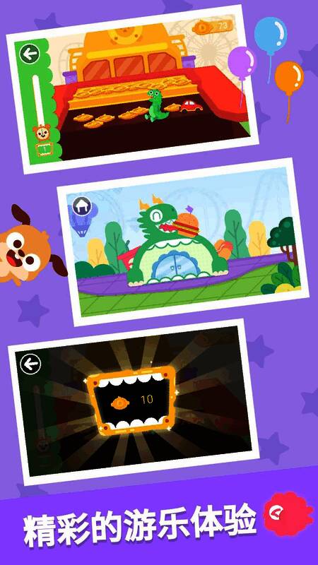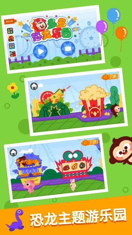1、多多恐龙乐园涵盖超级打地鼠、疯狂钓鱼机、恐龙转转转、多多美食街等多款游戏。