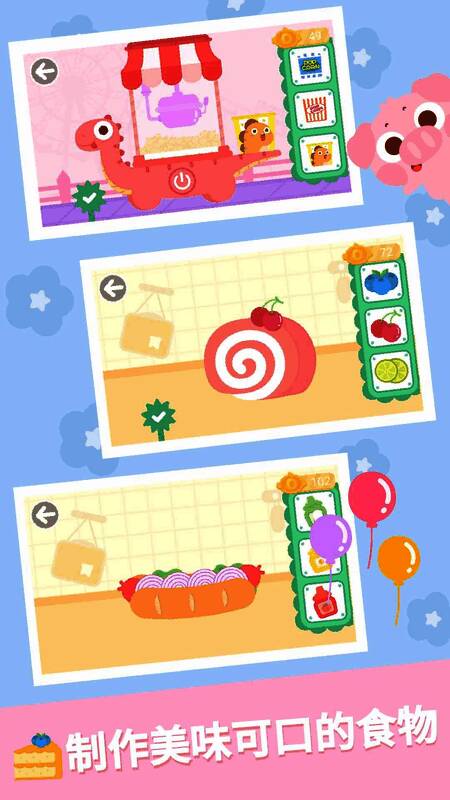 3、宝宝按提示操作游戏,可进行制作美食、钓鱼、打地鼠等活动,趣味十足。