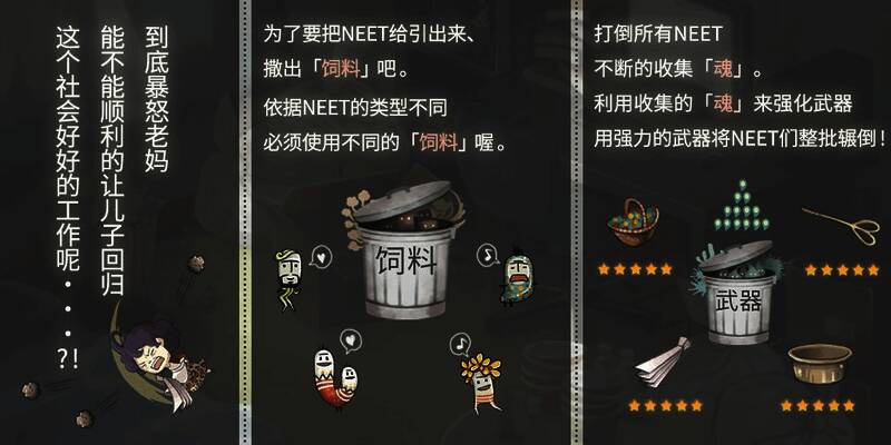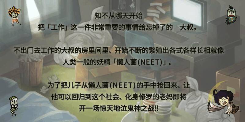 这是一个常见的母子故事,是一款刻画坚决与不工作儿子斗争到底的老妈的放置型养成游戏。玩家要不断点击,打倒大量涌入画面的丑陋、讨厌的邪恶妖精「NEET懒人菌」,将它们登录到图鉴中。还能听听NEET们那些令人啼笑皆非的“不去工作的理由”。随着游戏推进,故事剧情也会不断发展,这位不愿出门工作的大叔和老妈之间的故事将有冲击性的结果。该游戏可免费玩到最后一关,建议大家每天抽出一点时间来玩,为忙碌疲惫的生活带来一段疗愈时光。