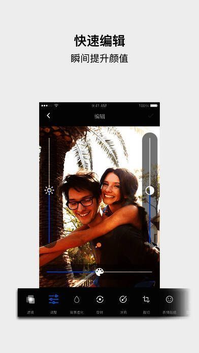 支持iOS9,在iOS9系统上表现卓越,快捷、流畅、清晰又有趣;简洁设计,界面直观,可快速切换拍照效果,轻松使用滤镜;实时滤镜,提供众多精美滤镜,拍照或编辑时可实时预览滤镜效果;高清拍照,让图片清晰展现精彩生活。