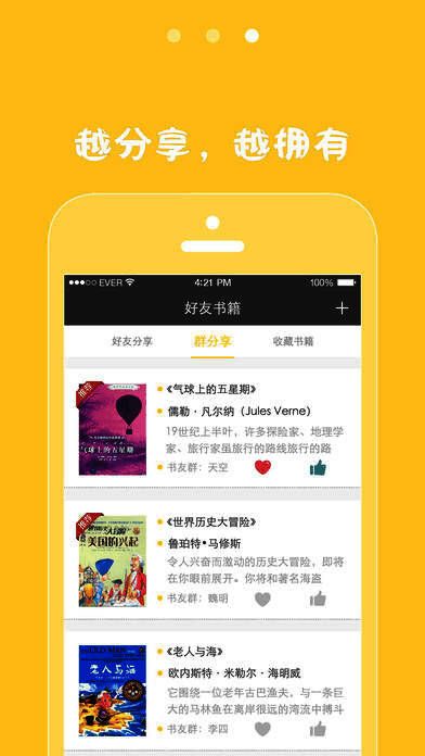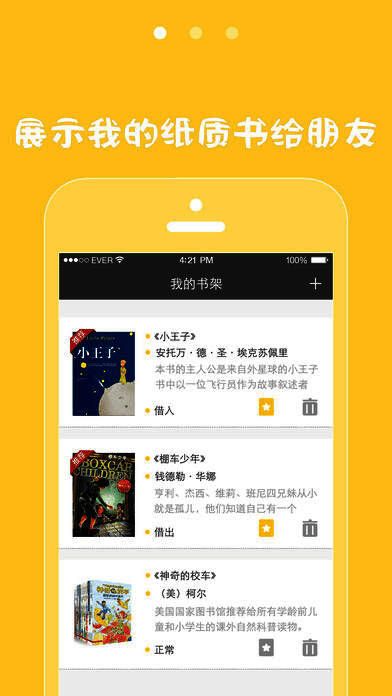 将自己的纸质书与朋友共享,共享越多收获越多。能知晓朋友或附近之人拥有的书籍及正在阅读的内容,实现互相借阅。可添加好友或群组,一同探讨书籍,告别书荒。将这种分享方式告知朋友,共建免费纸质图书馆。通过ISBN条码扫描,便捷管理个人藏书,清晰明了。