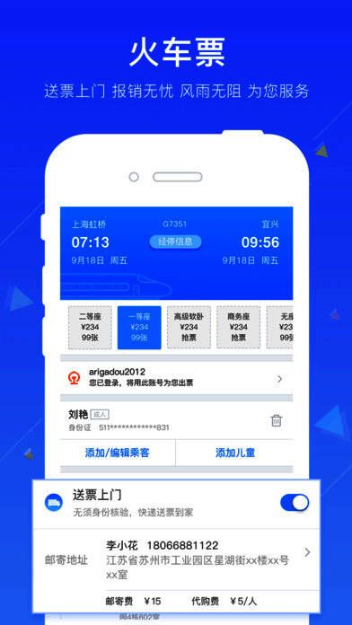 3、【火车票】送票上门,报销无忧,风雨无阻为您服务。