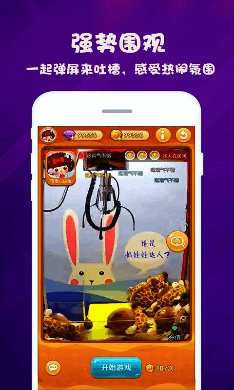 2、围观弹幕,直播添乐:直播抓娃娃,喊朋友围观吐槽,弹幕点燃抓娃娃热情。抓娃达人可接受膜拜打call。