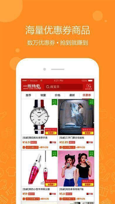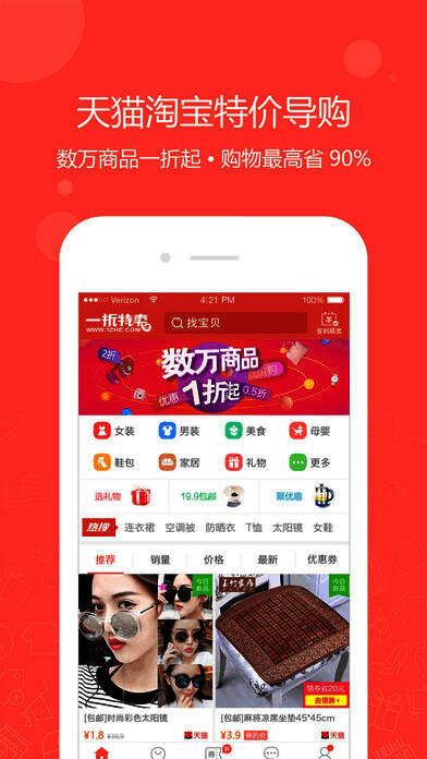1、涵盖最全的折扣促销商品;2、天猫淘宝商品 1 折起;3、独家挑选 9.9 包邮、19.9 包邮精品;4、拥有海量优惠券商品。