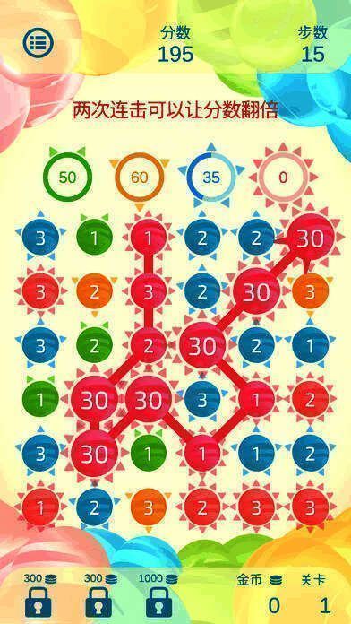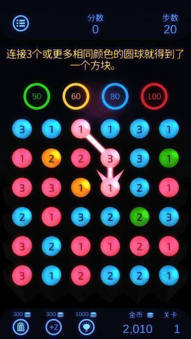 1、玩家可自由垂直、水平或对角线连接圆球。虽规则简单,但不同连接路径分数差异大。