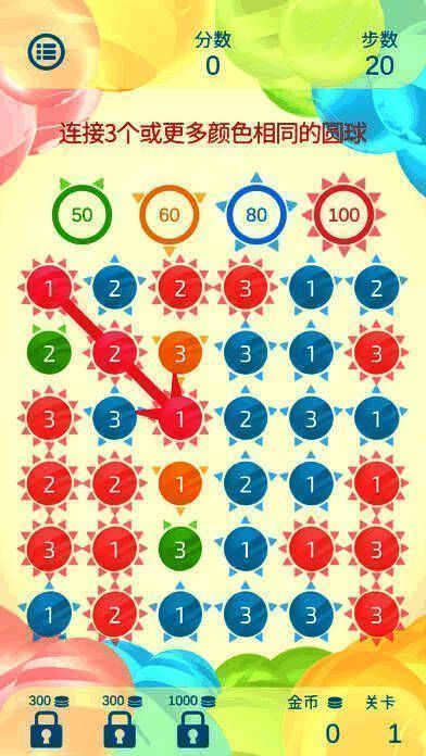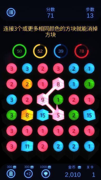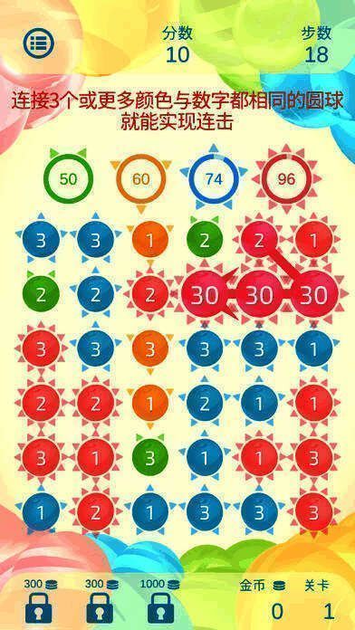 1、颜色或数字相同的圆形连接可消除,连得越多得分越高。