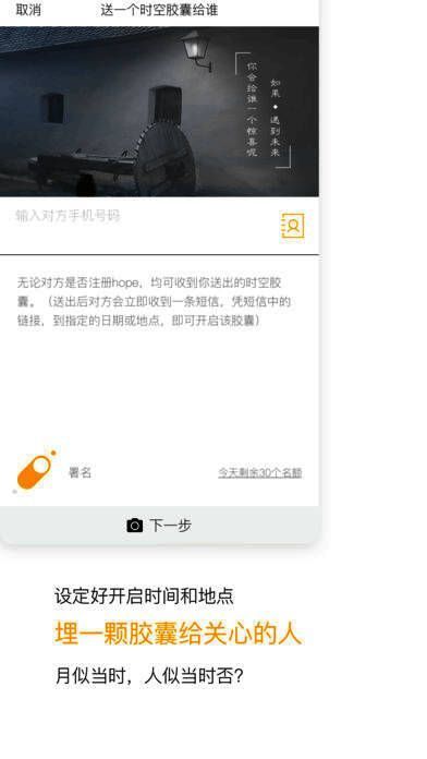 hopeAPP是手机端社交类软件,用户能用它为自己或他人写下想说的话,指定时间开启,体验跨越时空的惊喜,想给未来的自己或朋友留言的用户可直接下载。
