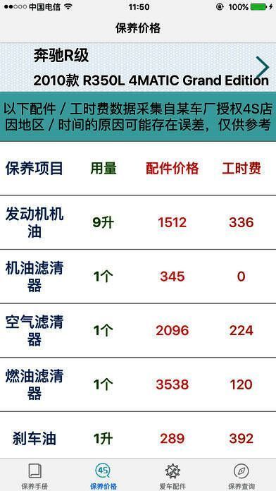- 数据列举细致,像保养价格里包含了发动机机油、机油滤清器、空气滤清器、燃油滤清器、刹车油等。
