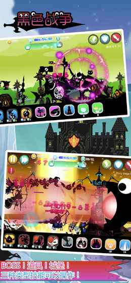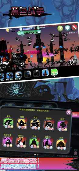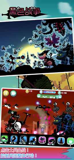 《黑色战争》是一款画风新颖的卡通战争手游。它操作轻松,玩家点击屏幕即可,需收集各类兵种并不断升级培养,以策略战斗带来全新体验。游戏在传统出兵玩法上,增加后退、防御、进攻指令,还设有制造“大怪”的系统,很值得出兵及即时战略游戏玩家尝试。