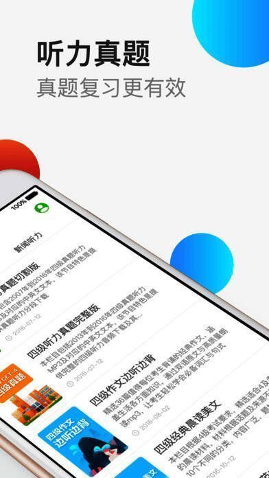 为你推送四级听力真题、四级作文范文、四级经典晨读美文、四级词汇以及每日新闻更新等海量音频,你可以尽情练习历年英语四六级真题听力;