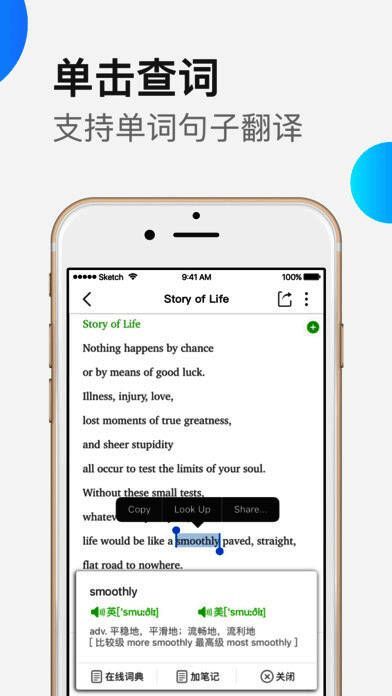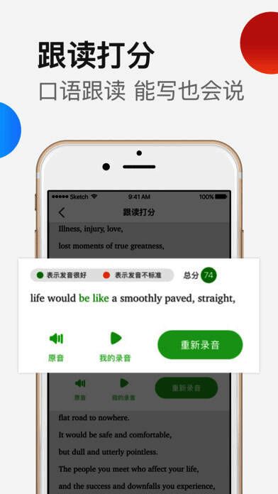 具备智能实时口语评分功能,逐句跟读并逐词打分,帮你攻克“开口说英语”的难关;