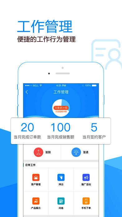 【工作管理】记录工作行为,地图定位助经销商分析销售区域空缺,收发货统计助零售商分析销售额,签到、推广等功能为一线人员提供贴心记录。