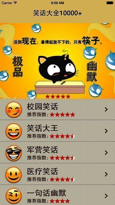 《笑话大全10000+++》专注于收集各类精彩段子,比如“活到现在,拿得起放不下的,只有筷子”。这款软件目前已经收录了10000多个精彩笑话,包含极品幽默、雷人语录、校园笑话等多种类型,并且还在持续收录更多笑话。