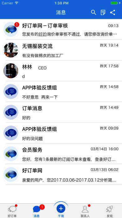 好订单千询是好订单网推出的移动社交APP。它依托好订单平台的丰富资源,为广大纺织服装行业从业者提供了高效、便捷的移动沟通与客户管理工具,能大幅提高对接效率,助力更好地完成从需求到订单的转化,还能为双方积累更多合适的业务伙伴。