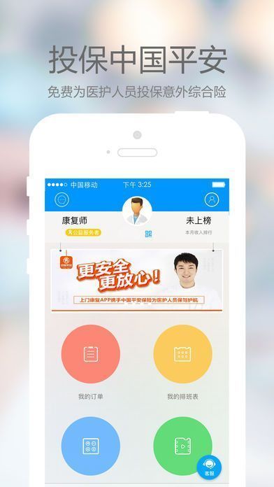 上门康复是中国中医集团专门为医生、护士、康复师打造的移动医疗平台。平台为每位上门服务的医护人员购买了中国平安的保险,切实保障他们的利益。