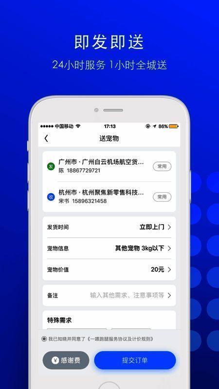 提供同城跑腿、快递、急件处理、小时工服务以及办事协助等,可递送鲜花、药品、烟酒、宠物、书籍、衣服、数码产品等,也能运送新鲜食物、水果、蛋糕、零食、外卖,还能传递合同、文件、发票、身份证、护照、钱包、钥匙等。采用专人专车模式,既快速又安全。